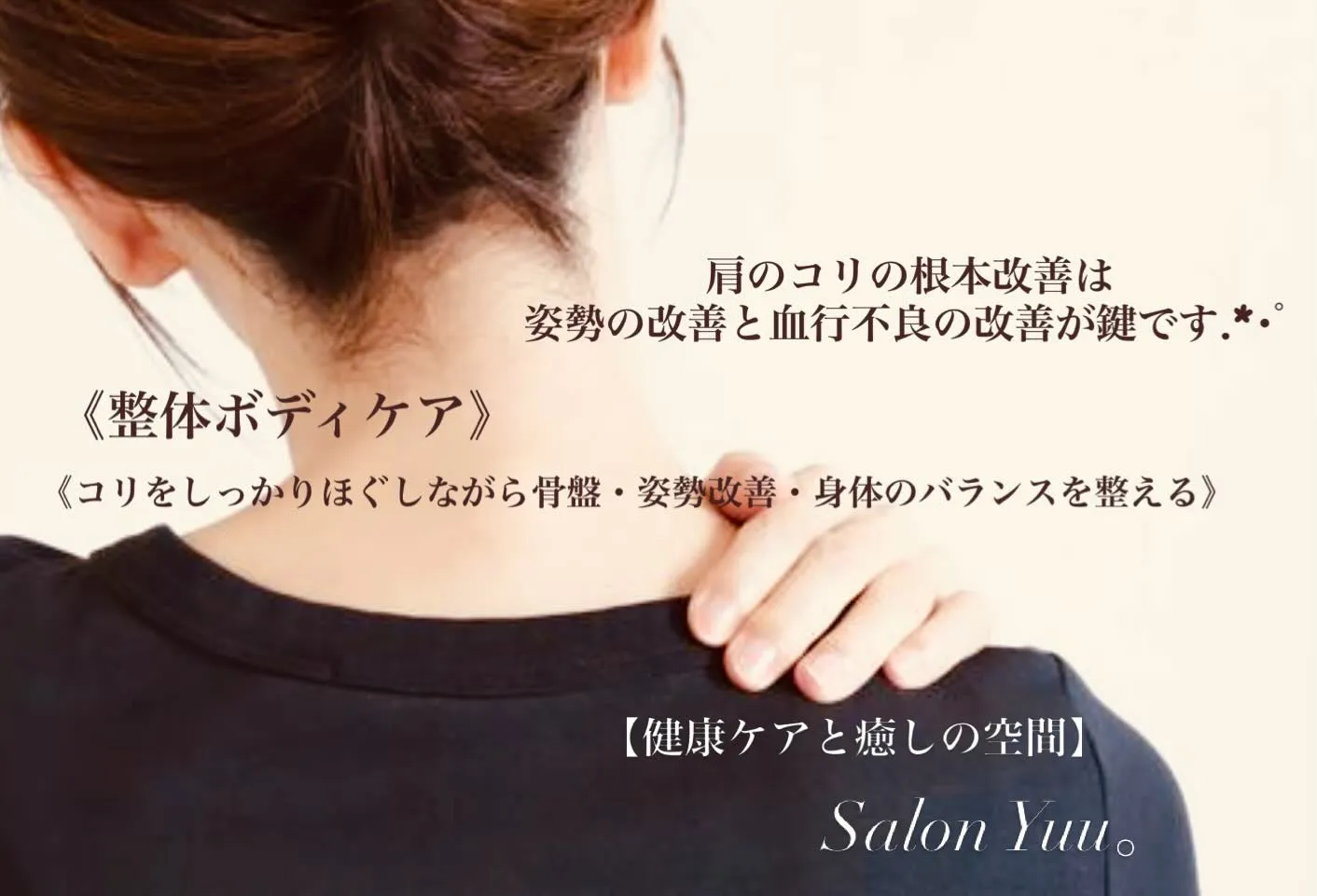 肩のコリの根本改善は、姿勢の改善(特に猫背・巻き肩・ストレートネックの解消)と血行不良の改善が鍵となります.*・゚