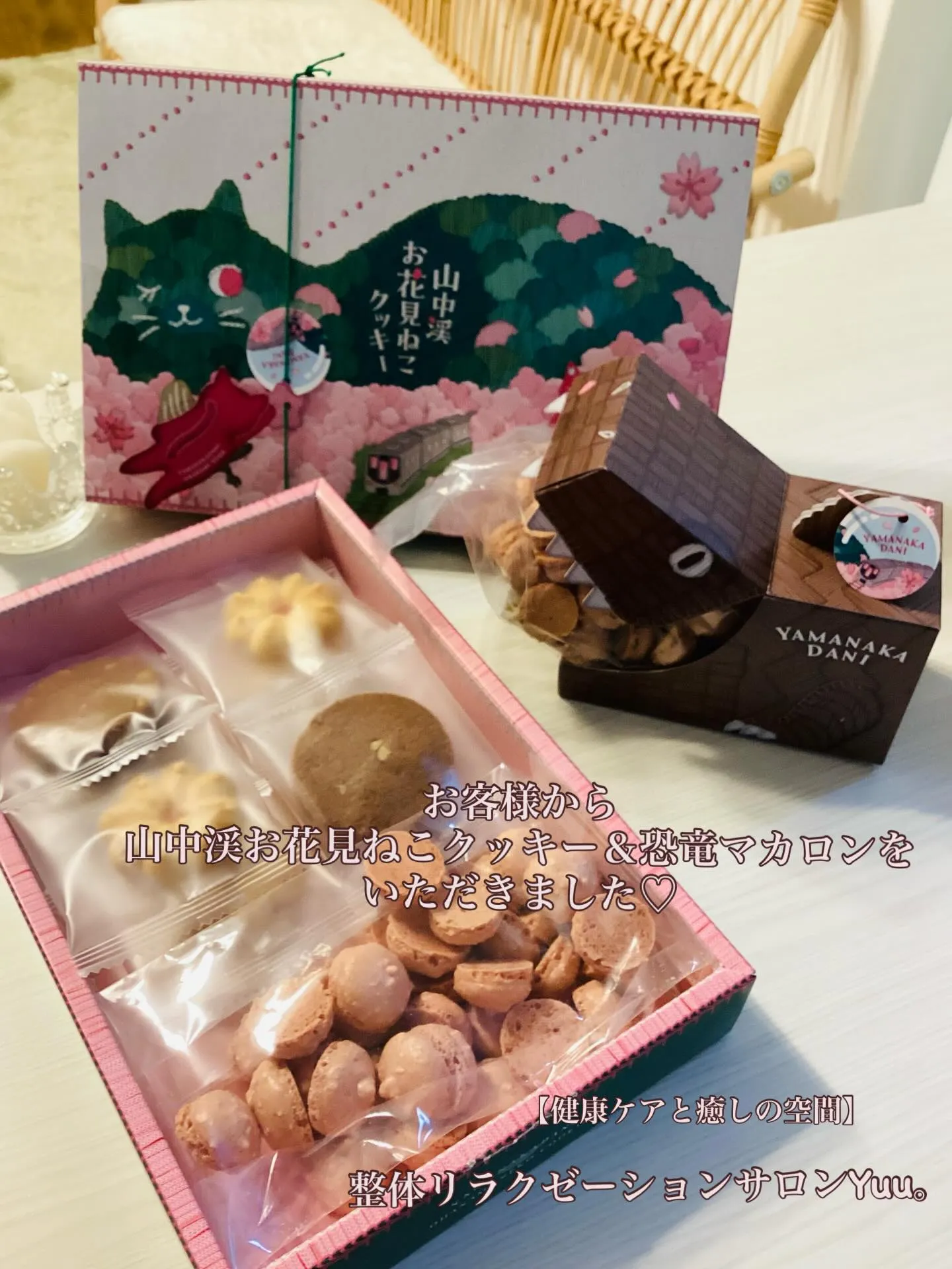 お客様から、山中渓お花見ねこクッキーと恐竜マカロンをいただきました🌼*・♡